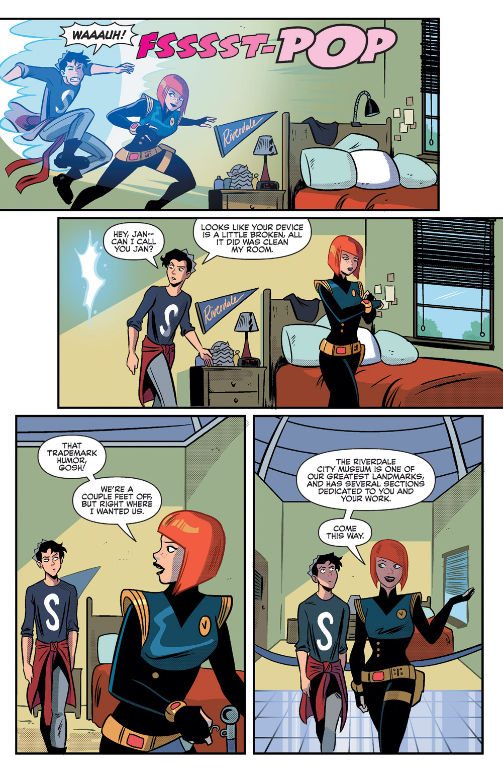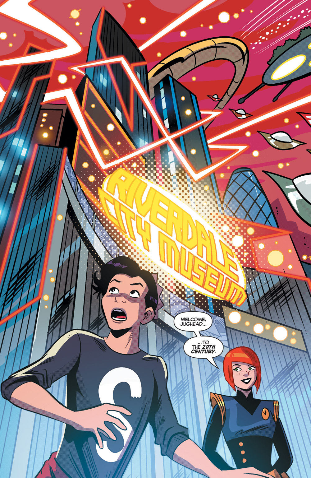 Journey with Jughead to the 29th Century! January McAndrews, head of the Time Police, explains the rules of time travel, and how Jughead’s already created alternate timelines they now have to police. But all the praise in the world isn’t fixing Jughead’s pie problem, and he’s realizing that everyone seems to be intentionally keeping him from time traveling. He’s getting angry, and things haven’t even gotten weird yet!
