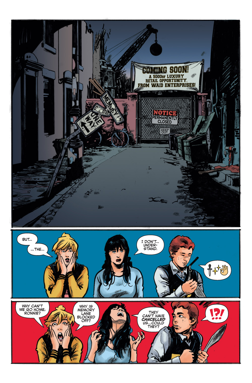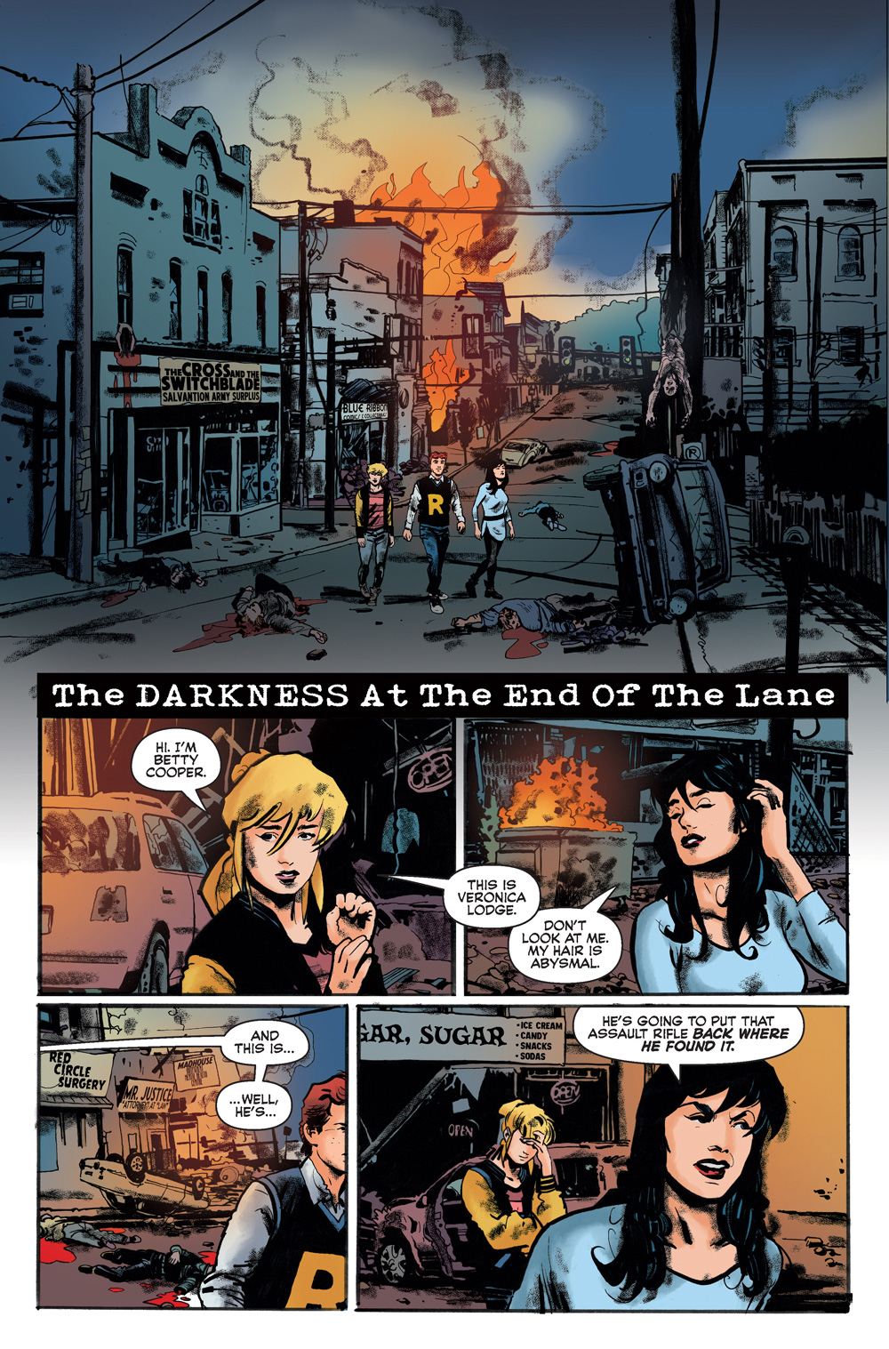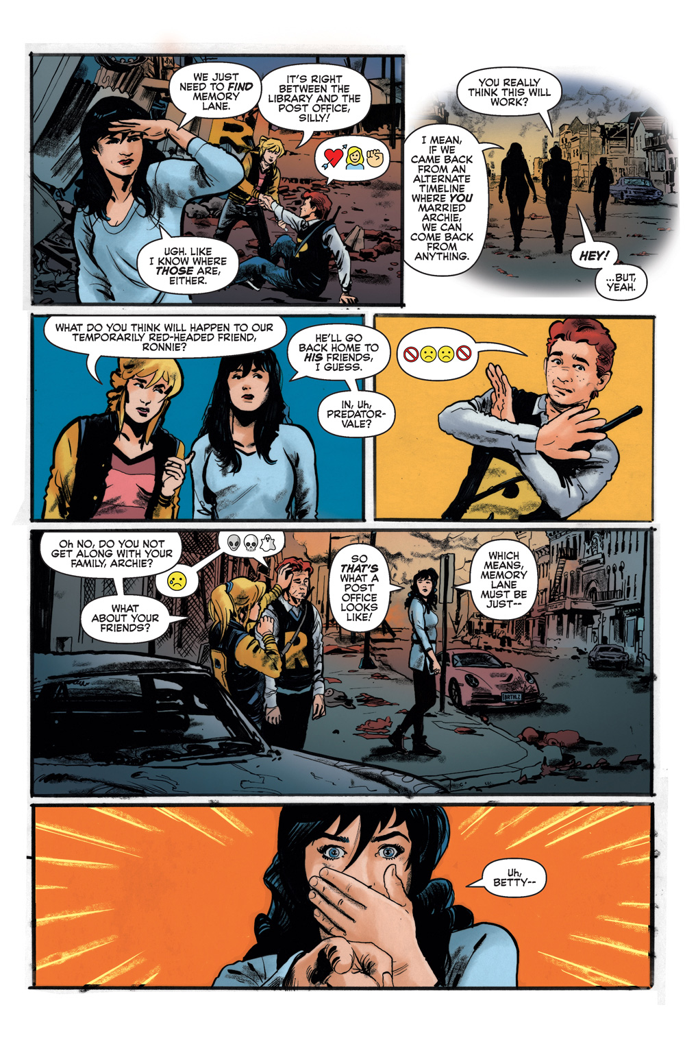 Betty, Veronica, and Predator-Archie have been left in the wreckage of their town, all their friends dead. Normally, they’d just go down Memory Lane and get home again where everything’s okay, but that’s no longer an option. It isn’t until they find an undamaged car and drive it down a different road where they can finally return to Riverdale—but their hometown feels different. And it’s made even more bizarre when they come face-to-face with a few people they’d never expect: themselves. Only different, newer versions. Little do they know, Predators on Mars are watching them—planning their next attack.