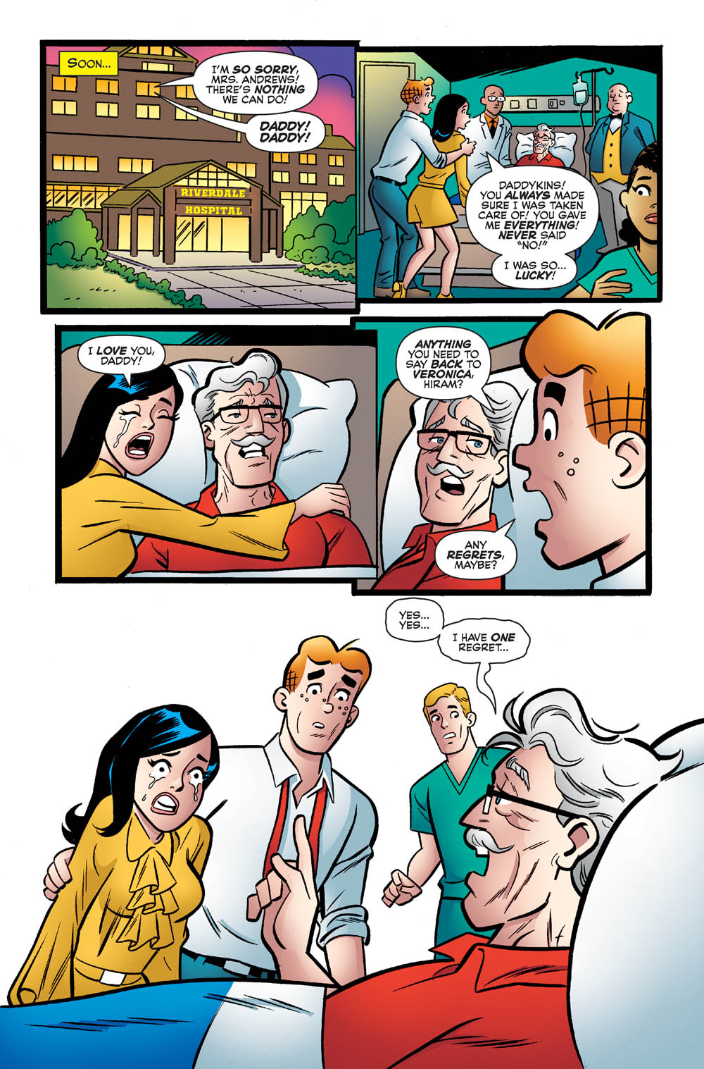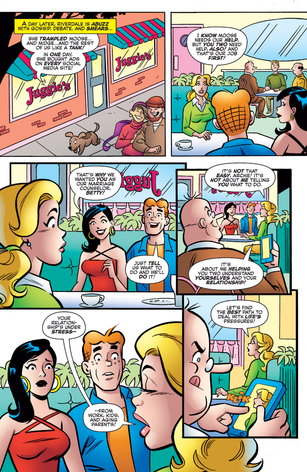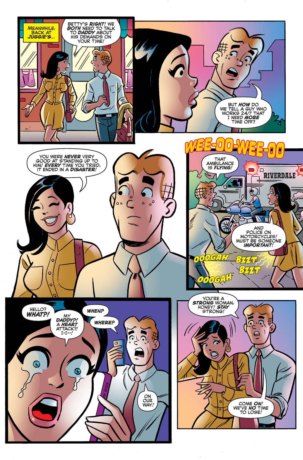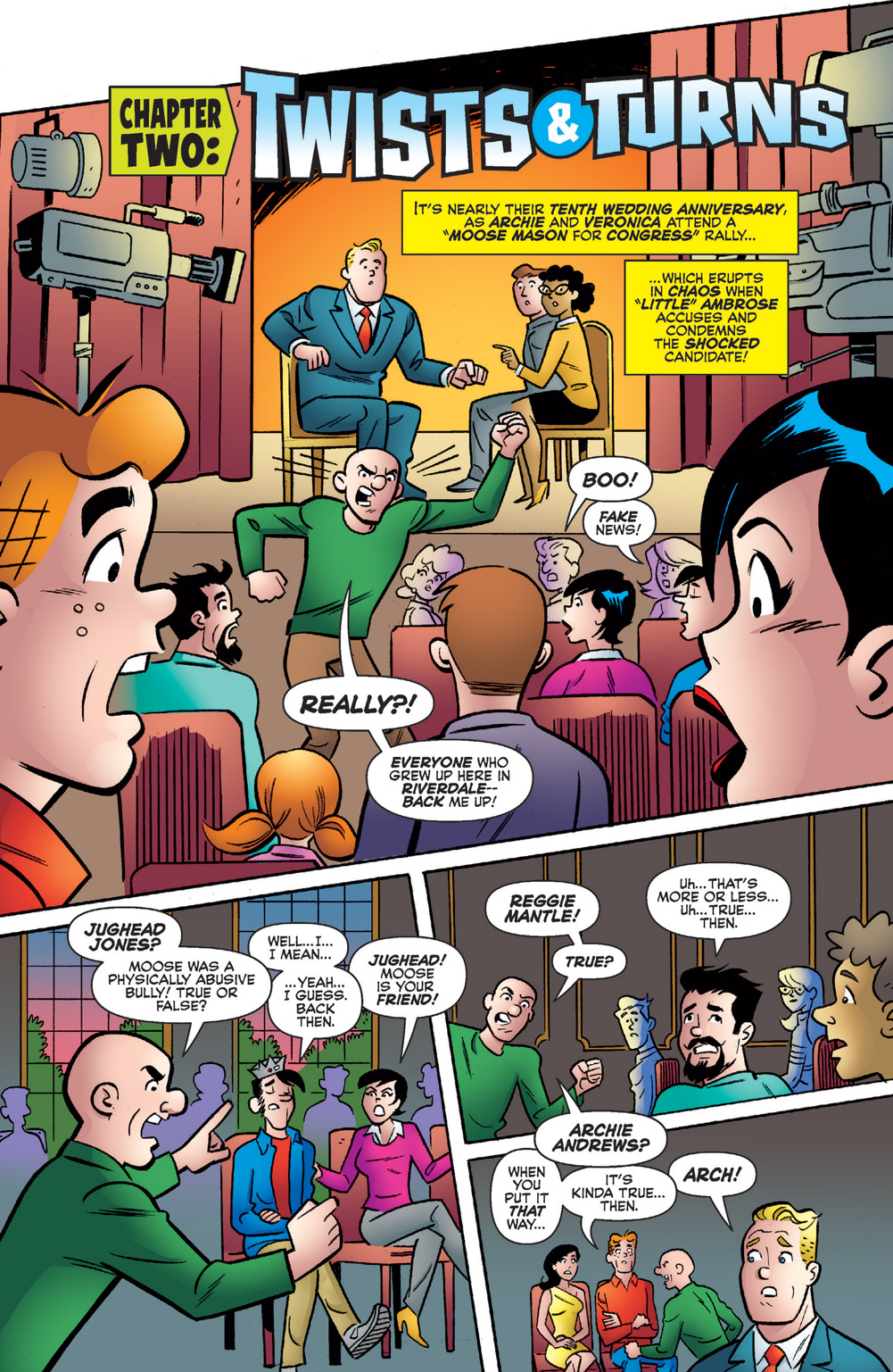 The story that follows Archie’s two possible futures—one where he’s married to Veronica and another where he’s married to Betty—continues! It’s nearly Archie and Veronica’s tenth anniversary—and they’re celebrating it by attending a Moose Mason for Congress rally! And while the action heats up on the political field, things turn dire in the Lodge household. Meanwhile, nearing Archie and Betty’s tenth anniversary, a mysterious call from Dilton Doiley alerts the couple to leave New York immediately and return to Riverdale!