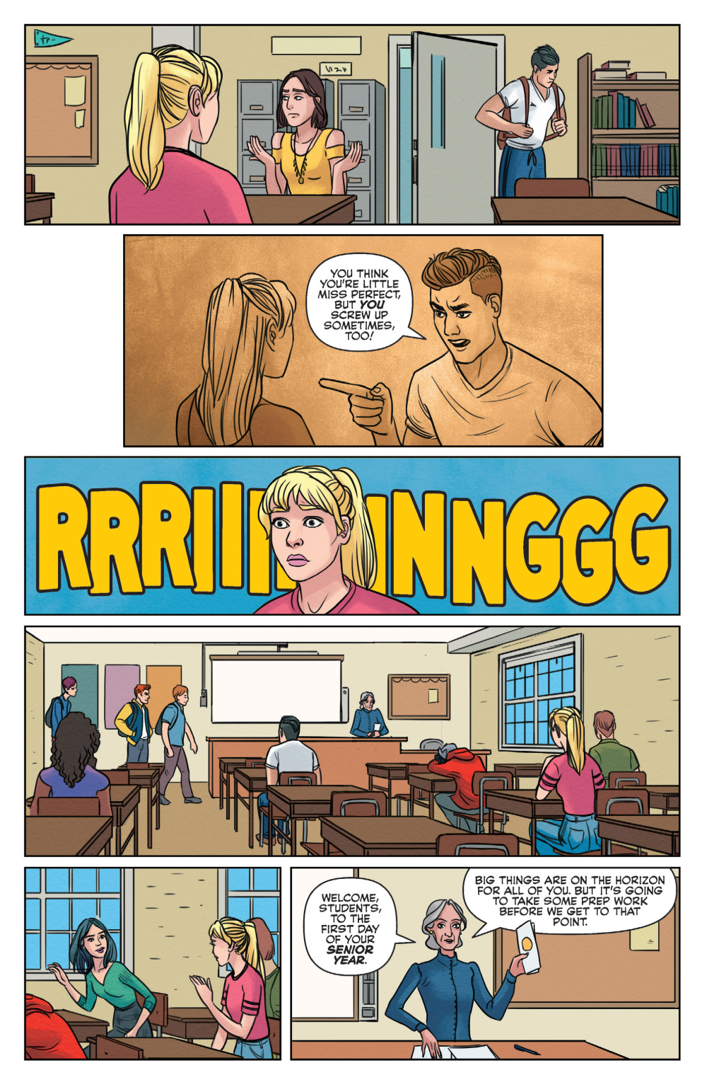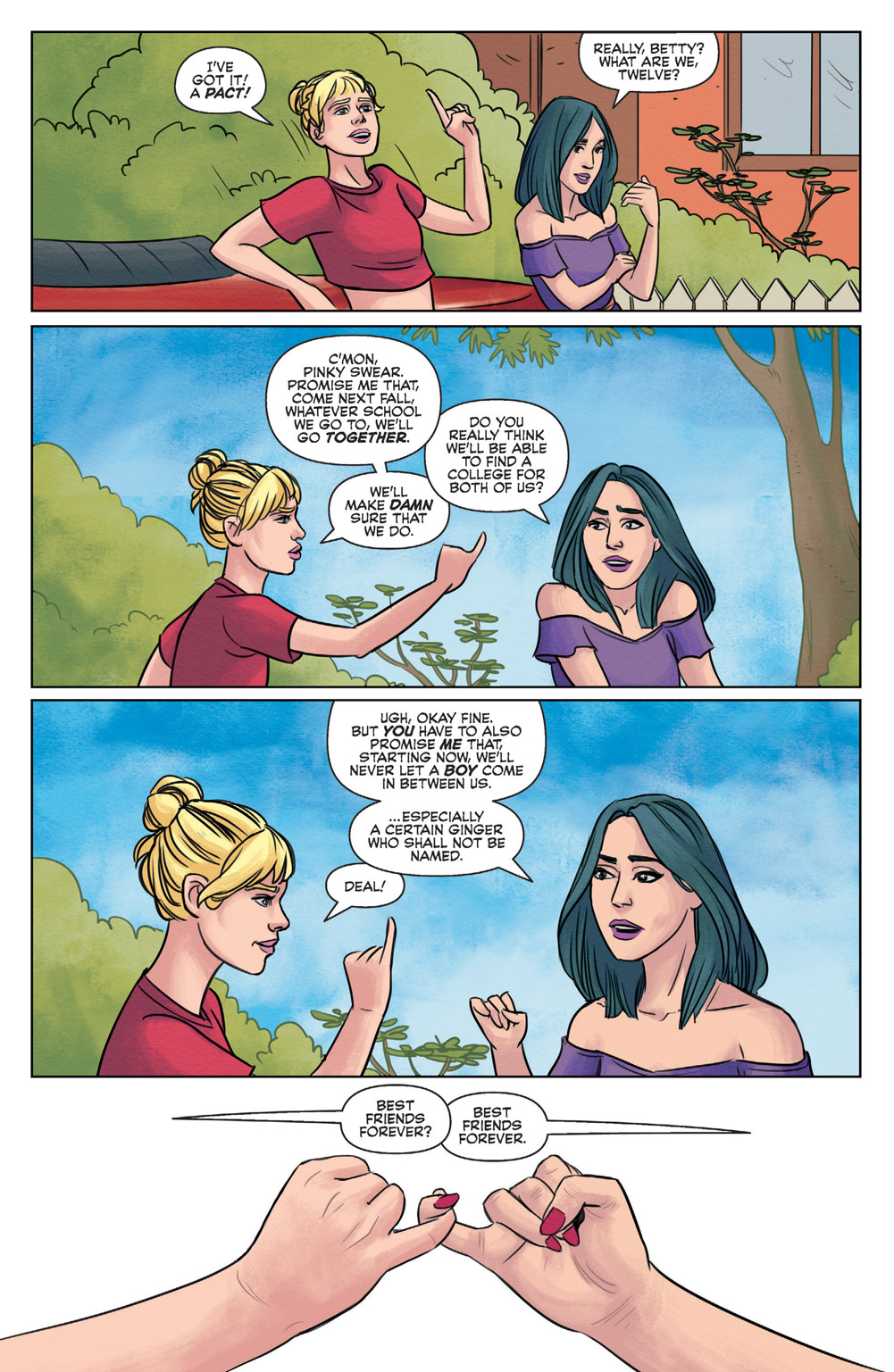 Rising stars Jamie Lee Rotante (Betty & Veronica: Vixens) and artist Sandra Lanz (Star Trek: Waypoint) take Betty and Veronica where they’ve never gone before–their senior year of high school! Only one school year stands between them and freedom, but when the two BFFs think they’ll be attending the same college in the fall find out that their plans have changed, their senior year—and their friendship—is put to the test!