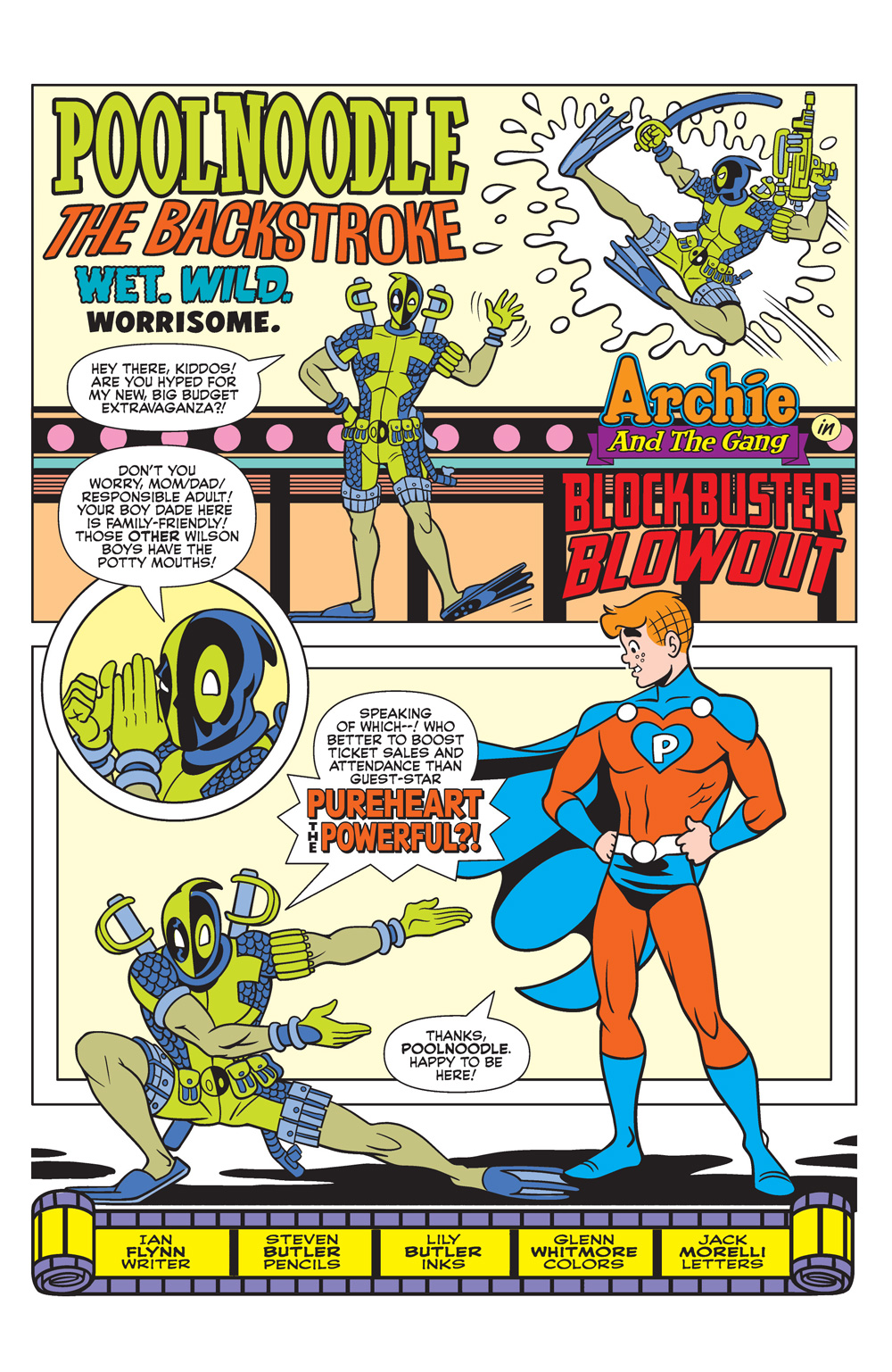 In a new destined-to-be-classic story called “Blockbuster Blowout” by Ian Flynn and Steven Butler, the wise-cracking warrior known only as PoolNoodle shows up in Riverdale just in time to help superhero Pureheart the Powerful with a plan to jazz up the very story they’re in with guest appearances. The problem is, this guy loves to talk and it might take them the whole five pages to figure out the story! If you like laughing (and we assume you do if you’re here) then you’ll love this one! There’s a sneak peek at that one below.
