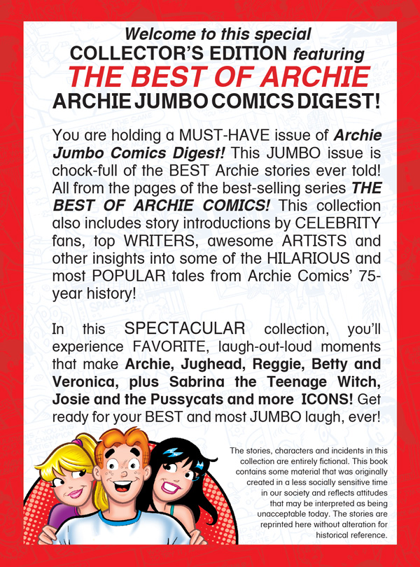 Don’t miss this must-have issue of ARCHIE JUMBO COMICS DIGEST! This jumbo issue is chock-full of the best Archie stories ever told! All from the pages of the best-selling series THE BEST OF ARCHIE COMICS! This collection also includes story introductions by celebrity fans, top writers, awesome artists, and other insights into some of the hilarious and most popular tales from Archie Comics’ 75-year history!