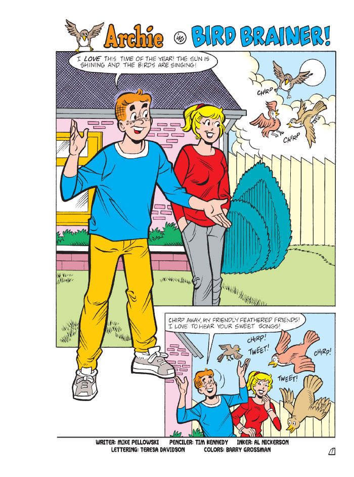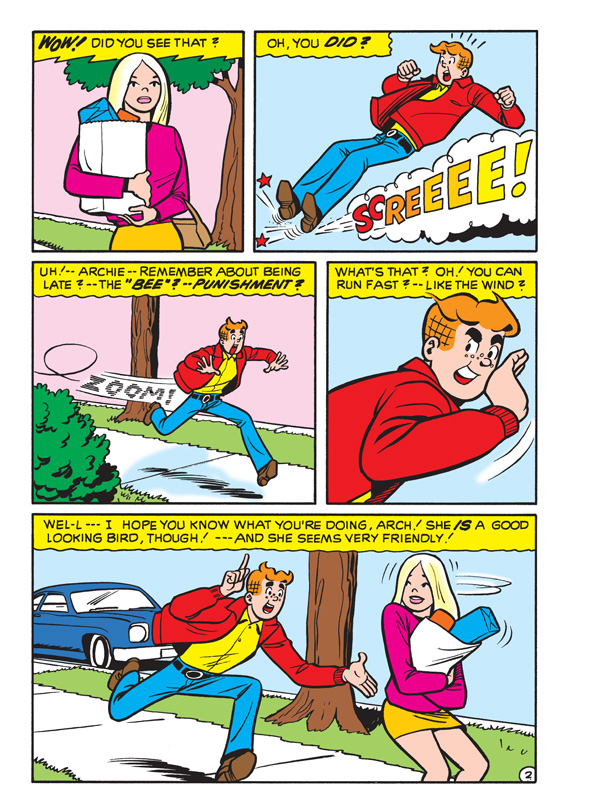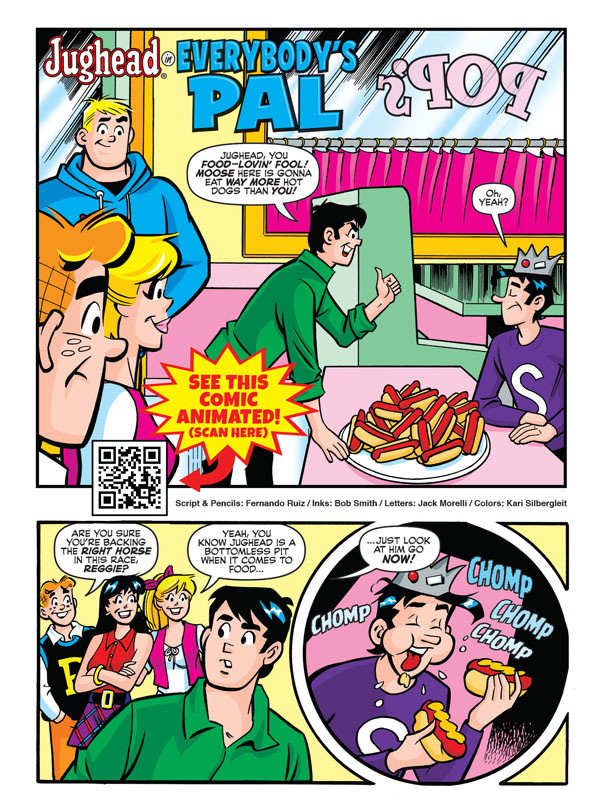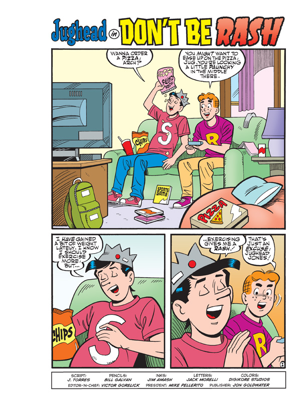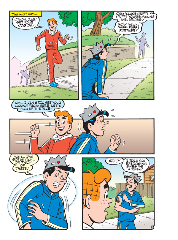 When Archie starts starting to get worried about his gluttonous pal Jughead’s unhealthy eating habits, he tries to get him into exercising. It’s to no avail, however, since Jughead insists that any kind of strenuous activity gives him a rash. Archie thinks it’s all in Jughead’s jug-head, but how can he explain those bumps on Jughead’s skin after every sport? Find out if Jughead’s truly allergic to exercise in “Don’t Be So Rash,” the funny lead story to this comics digest!