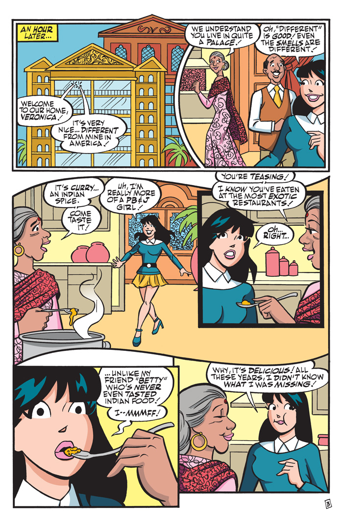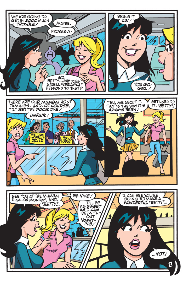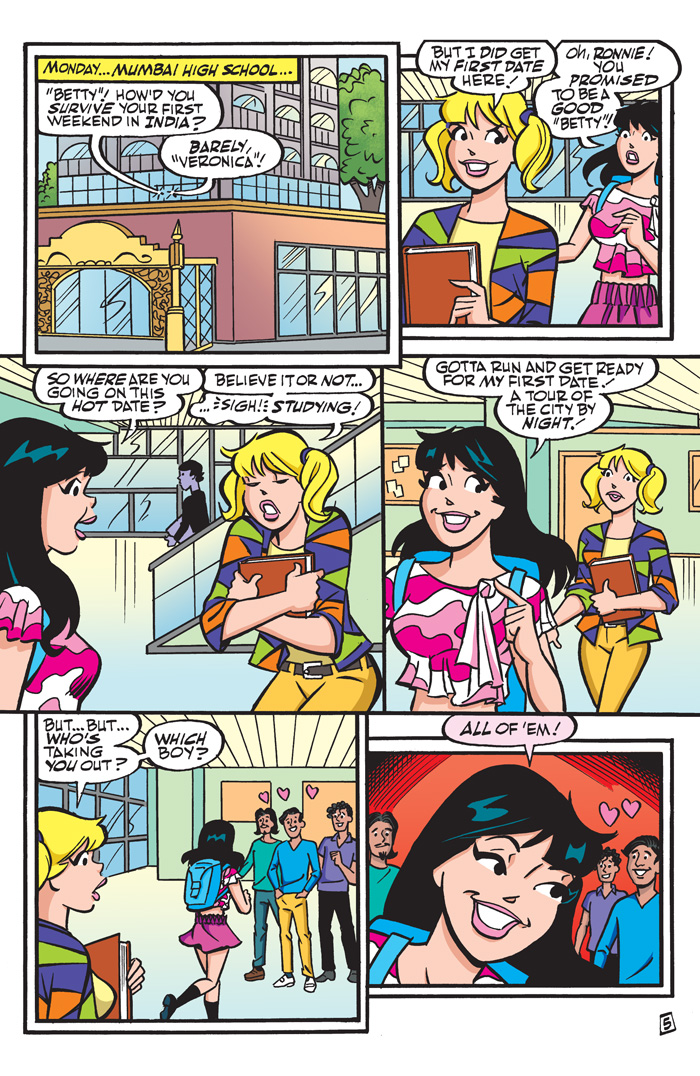 The girls have arrived in Mumbai, India! They’re ready to move into their temporary homes… and their new identities as Veronica takes on the role as “Betty,” and Betty takes on the role as “Veronica”! Will anyone catch onto their little game? Meanwhile, back in Riverdale, the boys are enjoying the acquaintances of the new transfer students Violette and Banni! But can these two new transfers ever really take the place of their beloved Veronica and Betty? Plus, we’re commemorating this milestone 275th issue with a double-sized issue featuring plenty of bonus content and multiple collector covers!