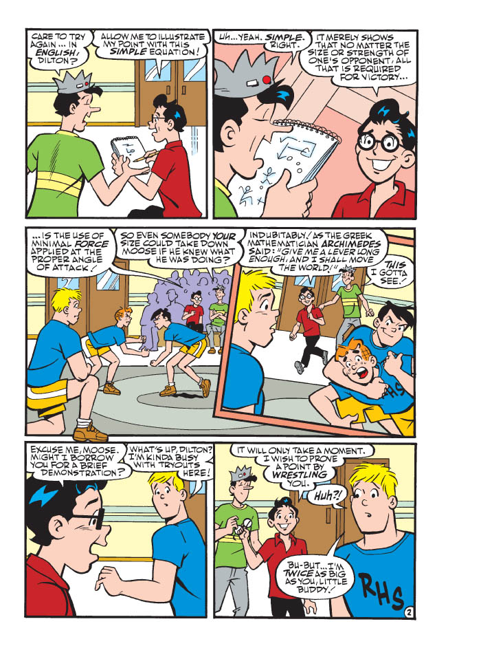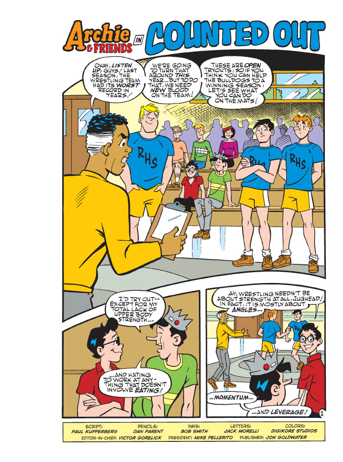Riverdale High School is holding out tryouts for the wrestling team—and Archie, Reggie and Jughead all hope to make it on the ropes! While the three use brute force and technique for their tryouts, Dilton is convinced that is instead a mathematical process. He argues that it’s all about leverage and angles and that, even someone at his size, could take down someone the size of Moose. The guys are skeptical and challenge him to prove his hypotheses. Will his equations be correct, or will Dilton be down for the count? Find out in “Counted Out,” the brand new lead story to this Comics Double Digest!