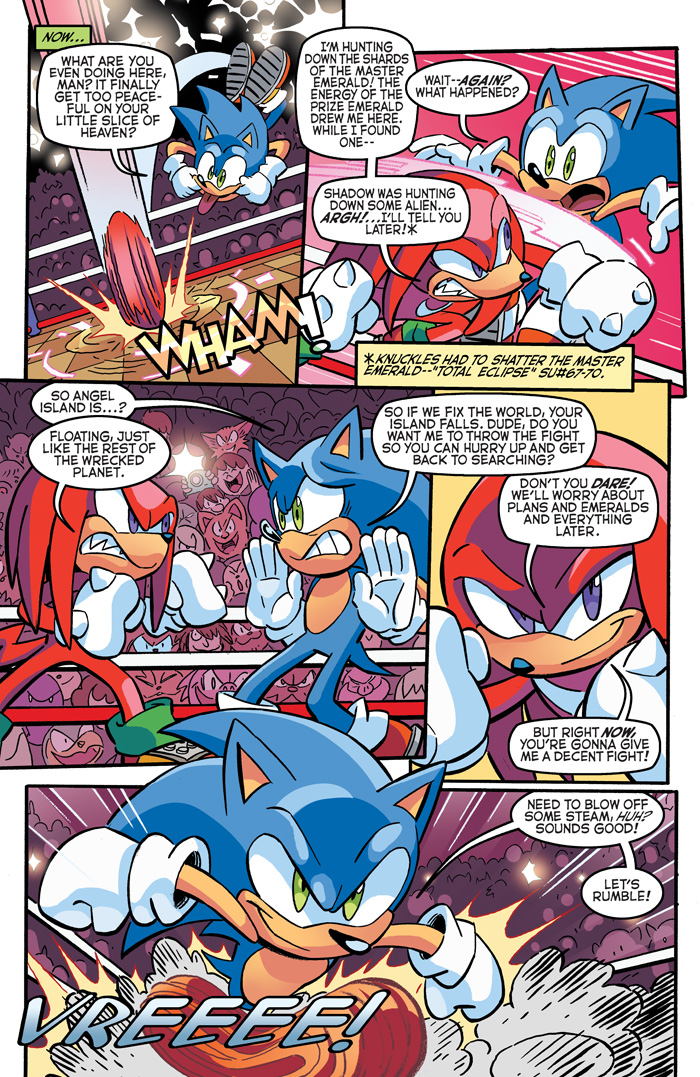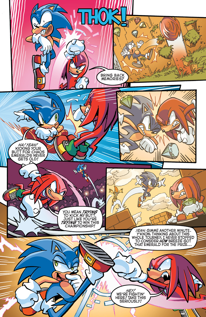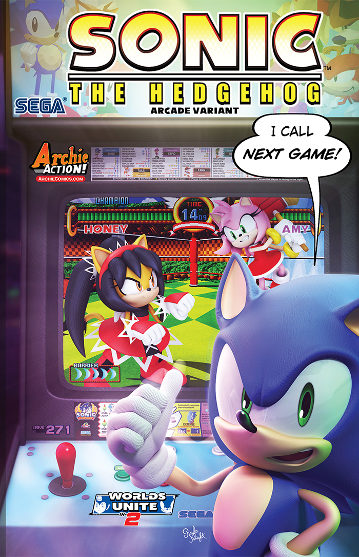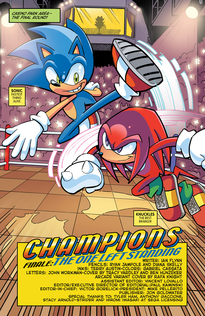 Grab a front row seat for the finale to the brawl-iest, punch-iest, contest-iest Sonic comic saga yet! “Champions” Part Four: It’s the battle you’ve all been waiting for (again!): Sonic versus Knuckles—for the title and the Chaos Emerald!  The old rivalry blazes to life as the True Blue and Rad Red throw down for glory—and for the fate of the entire world!  But with the vengeful Hooligans waiting in the shadows, and Metal Sonic en route, will they even get to finish their fight, or will their foes beat them to the punch? Featuring new cover art from Sonic art legend Tracy Yardley and a super-special new ARCADE VARIANT by the latest Sonic art superstar RAFA KNIGHT!
