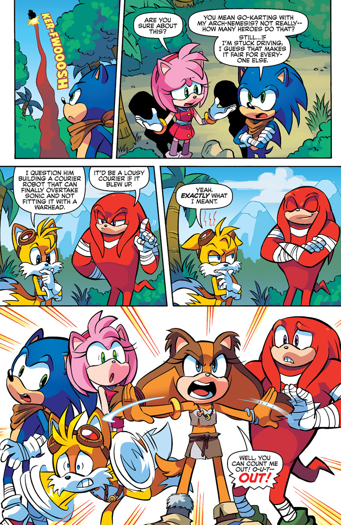 What…What is that sound? No, really—what on earth is that noise? Waitaminute… is that the sound of go-karts??? IT… IT—IS! LET THE RACE BEGIN IN “EVERYBODY’S SUPER SONIC RACING” PART ONE! (IS THE CAPS LOCK STILL ON, OH WAITAMINUTE, there we go. Much better.)  When Dr. Eggman sponsors a go-kart race around Sonic’s Island home, you know that dude is up to no good. The rules are as follows: no special powers, no weapons, and everyone has to drive a kart to keep things fair.  Since when does Eggy care about “fair”? What will happen to throw this race into a SPIN? How many rhetorical questions can we ask in one paragraph of solicit text?? Find out in this hyperbole-packed issue! Featuring cover art from Sonic comic extraordinaire Tracy Yardley, plus a new BOOM-Crew Sega art variant!