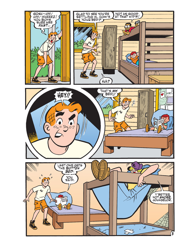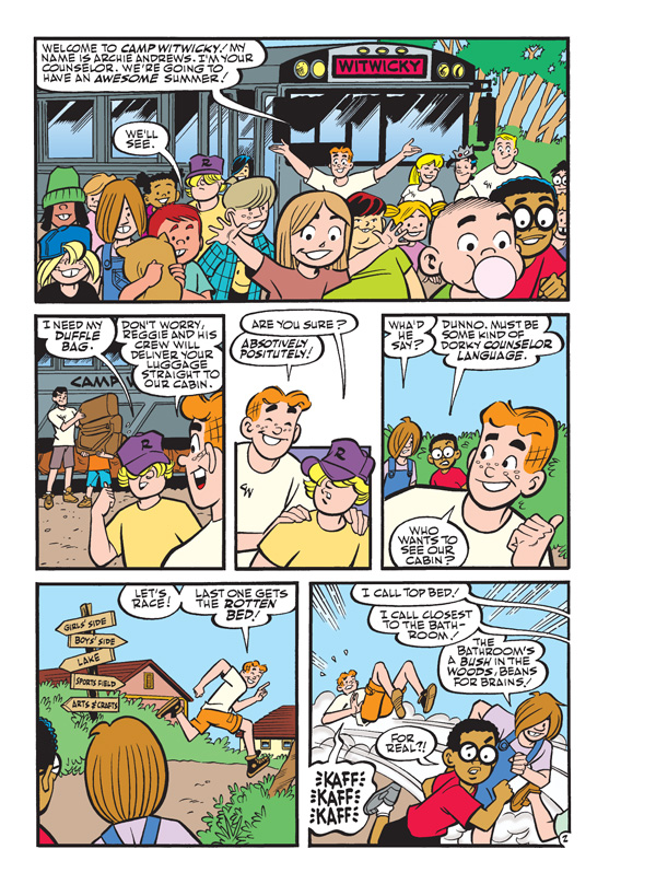Summer’s here and that means it’s time for some summer camp adventures! Archie and his friends are all counselors at Camp Witwicky—but Archie’s determined to be the BEST one this year! Of course, Archie can only be as good as his campers—and they’re not nearly as excited about summer camp as Archie is! Will Archie impress all his campers and be the best counselor Camp Witwicky has ever seen—or will his summer be a wash out? Find out in “All Camped Out!” the all-new, all-fun lead story to this comics double digest!
