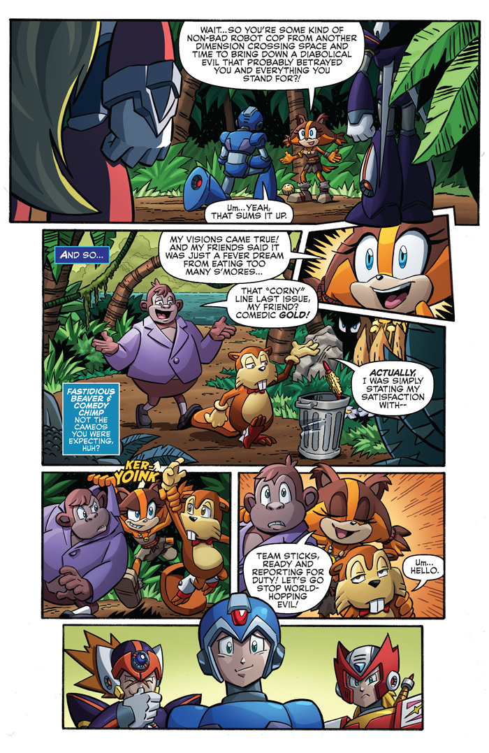It slices! It dices! It joins line-wide crossover events: it’s SONIC BOOM! “Sonic/Mega Man: Worlds Unite” Part Two: It was just another day at the races—y’know, the ones with the giant spider-mechs? Things start to get weird, even for the lovable, paranoid Sticks, when X and the Maverick Hunters arrived! Meanwhile, the epic bromance of the century is rekindled as the captured Drs. Eggman and Wily are forced to turn their life-long nemeses—Sonic and Mega Man—into minions for the terrifying Sigma! After the history-making “WORLDS COLLIDE” crossover event, Sonic the Hedgehog and Mega Man unite once more—and this time Sonic Boom and Mega Man X are joining the fray! Featuring cover art from the legendary Patrick “SPAZ” Spaziante, a special “happy fun time crossover” variant by Ryan Jampole and part 2 of the epic 12-part connecting variant cover series by artist Ben Bates!