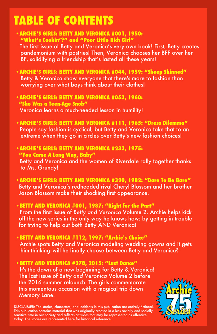 Celebrate the 75th anniversary of Archie Comics with this special retrospective presentation! Best frenemies Betty and Veronica have been fighting over Archie in their own series since 1950. Getting a fresh #1 in 1987, they’ve had their own series for 625 issues! In this collection, we present some of Betty and Veronica’s best and funniest adventures.