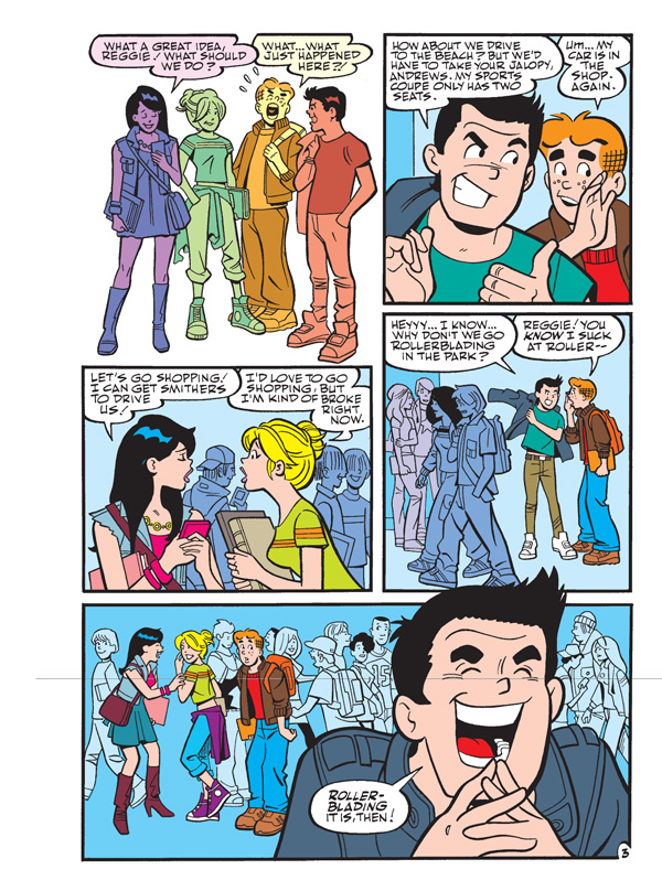 A rollerblading double date threatens to embarrass Archie in front of both Betty and Veronica! Can he learn how to blade in just a few days time in order to keep the date going smoothly and maintain his cool image? Or will Reggie be determined to skate him out of the ring… and into the hospital? Find out in “Cheat Skate,” the fun new lead story to this JUMBO-sized comics digest.