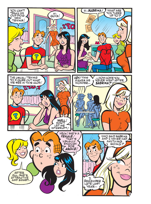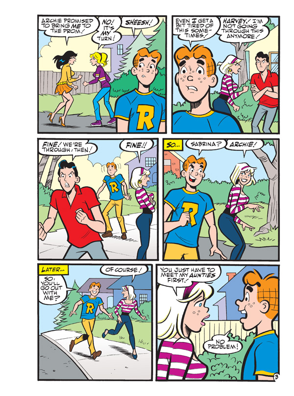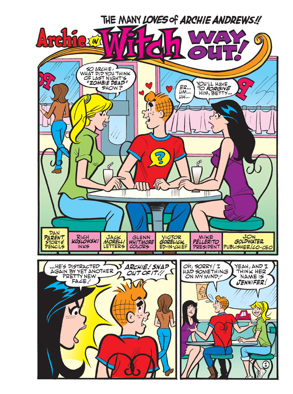 This time in “the Many Loves of Archie Andrews,” Archie has decided to set his sights on Sabrina the Teenage Witch! And, after being dumped by her long-time boyfriend, Harvey, Sabrina’s ready to move on—and our red-headed Romeo is just the mortal to do the trick! There’s only one person who’s standing in the way of true romance—actually, make that two people—Sabrina’s aunts Hilda and Zelda! If you think Mr. Lodge and Archie have clashed before… wait until you see Archie vs. Zelda and Hilda in “Witch Way Out!” the brand new lead story to this comics double digest!