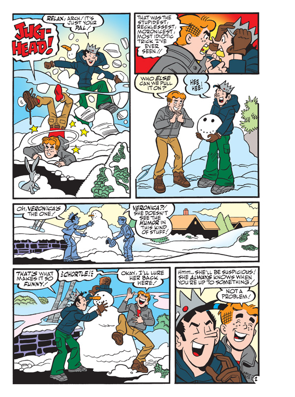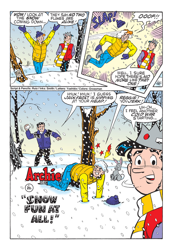 Jughead has devised the perfect winter prank—and Archie can’t wait to team up with him and get as many people as they can! But with Veronica as their first victim, will they successfully pull off their winter tricks, or will it snowball out of control and make the pranksters the prankees? Find out in “Snow Struck,” the hilarious lead story to this comics double digest featuring even more pages of winter fun!