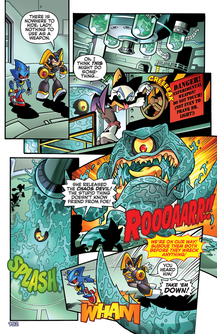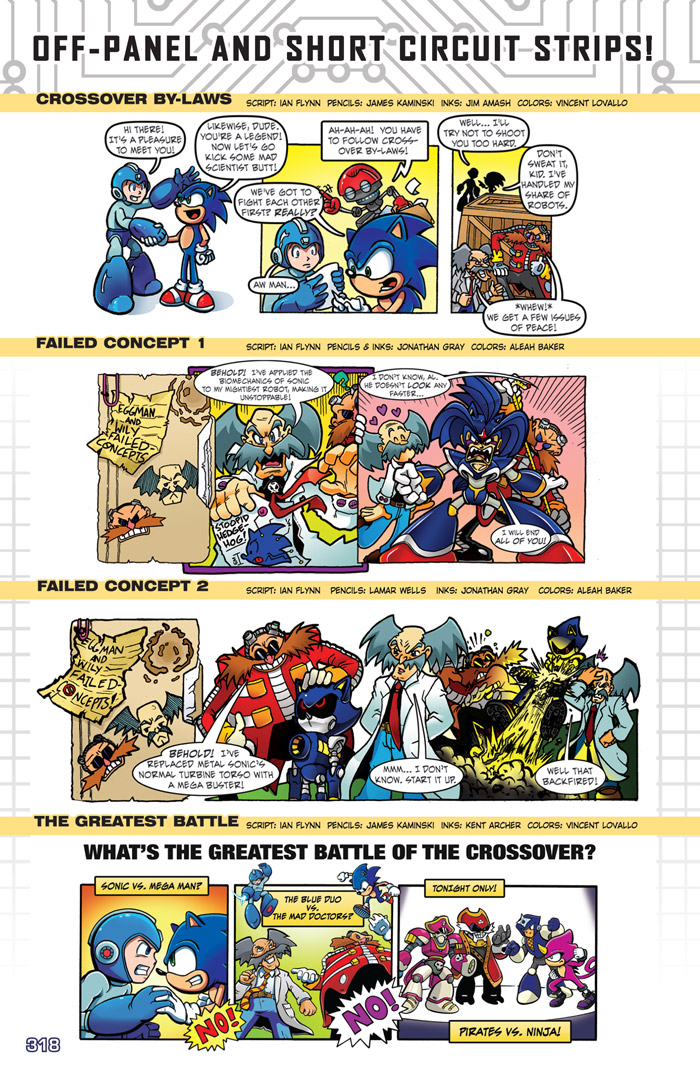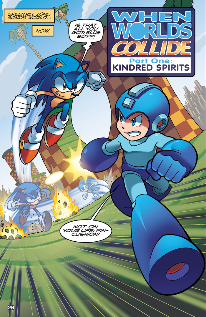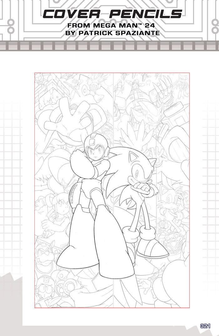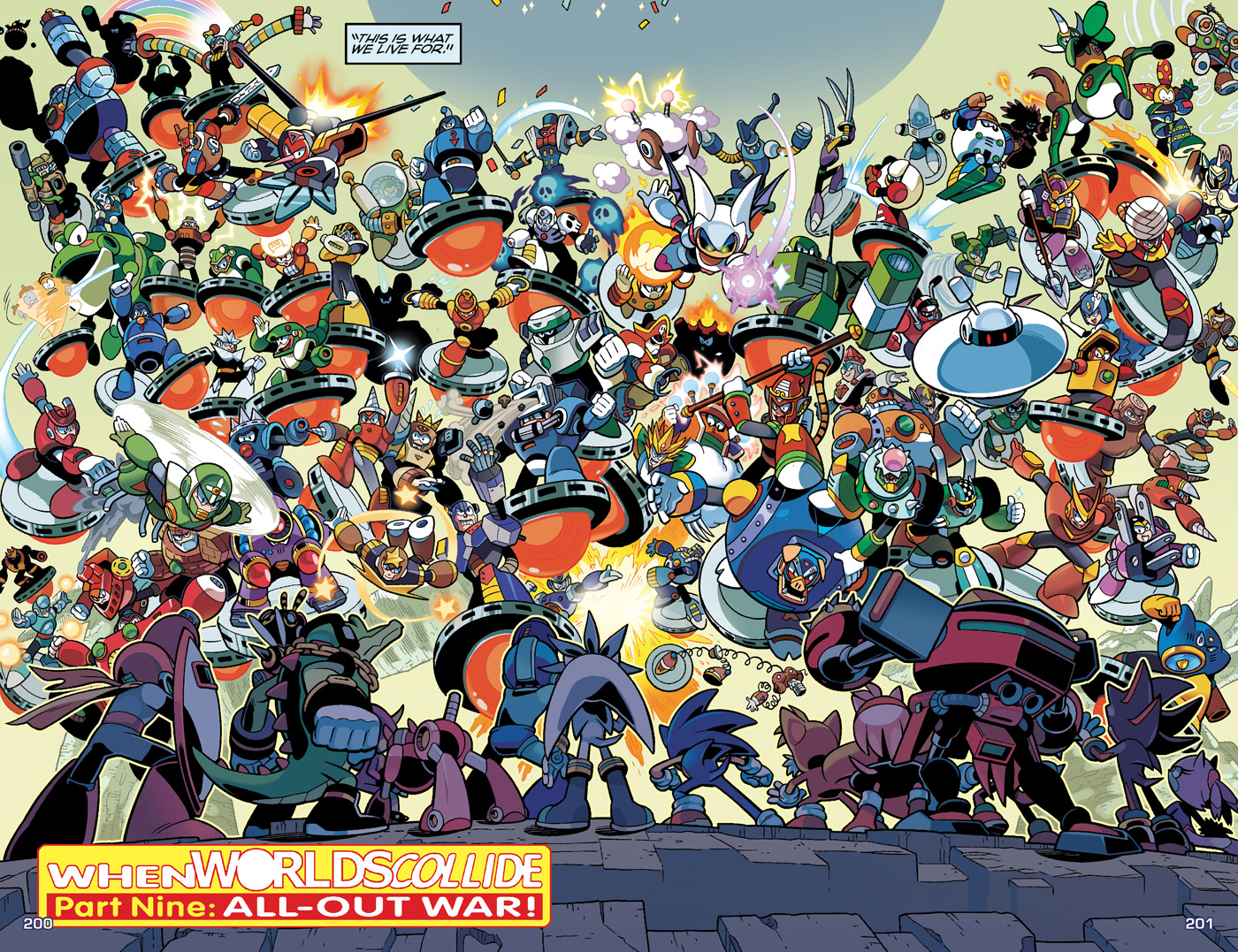 It’s the crossover of a lifetime! The team-up you’ve been dreaming of! Two of videogame history’s most iconic heroes come together for the greatest action story ever told! SONIC THE HEDGEHOG and MEGA MAN unite in WHEN WORLDS COLLIDE! It all begins with a meeting of the minds–EVIL minds! Dr. Wily makes contact with Dr. Eggman, and the two malicious mechanics conspire in a plan that will reshape entire worlds! Using the power of the Chaos Emeralds, they build themselves an unstoppable army of Robot Masters and Roboticized Masters–Sonic’s corrupted friends! It’s pan-dimensional panic as Sonic and Mega Man race to uncover the doctors’ diabolical plot, save Sonic’s friends, and brave the nightmarish landscape of the Skull Egg Zone! Along the way they gain new allies, Mega Man gains all new powers, and the stakes keep getting higher until two universe hang in the balance! You CANNOT miss this critically acclaimed crossover! Celebrated by old and new fans alike, beloved by critics and casual readers, this is one big love letter to all things SONIC and MEGA MAN! WORLDS COLLIDE collects the entire crossover event, containing SONIC THE HEDGEHOG #247-251, SONIC UNIVERSE #51-54, MEGA MAN #23-27 and material from SONIC THE HEDGEHOG #252 and MEGA MAN #28.