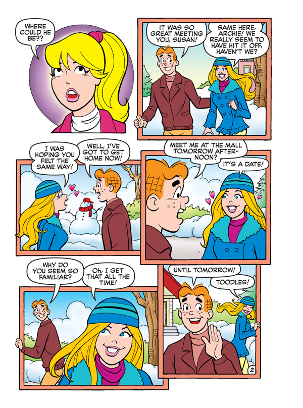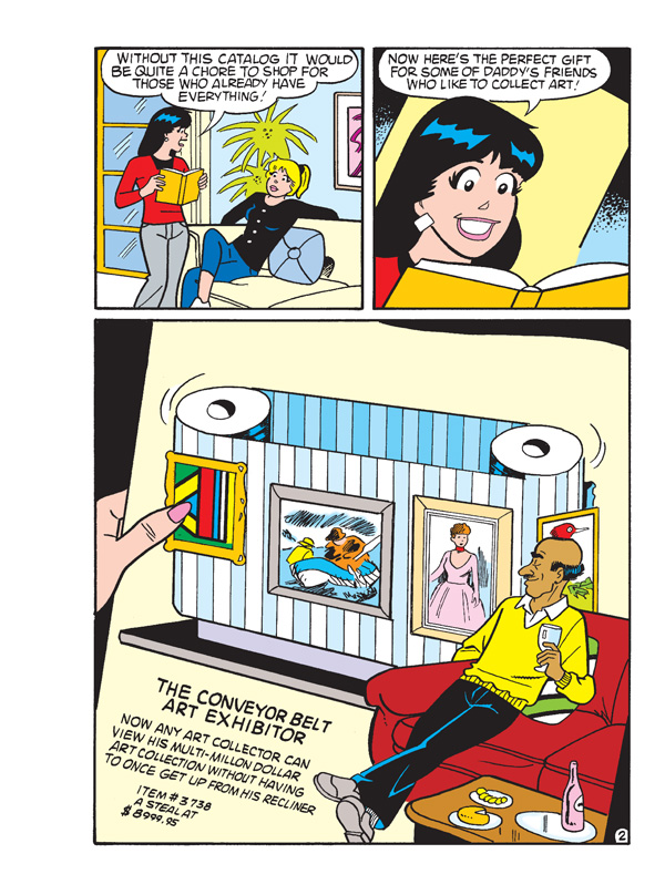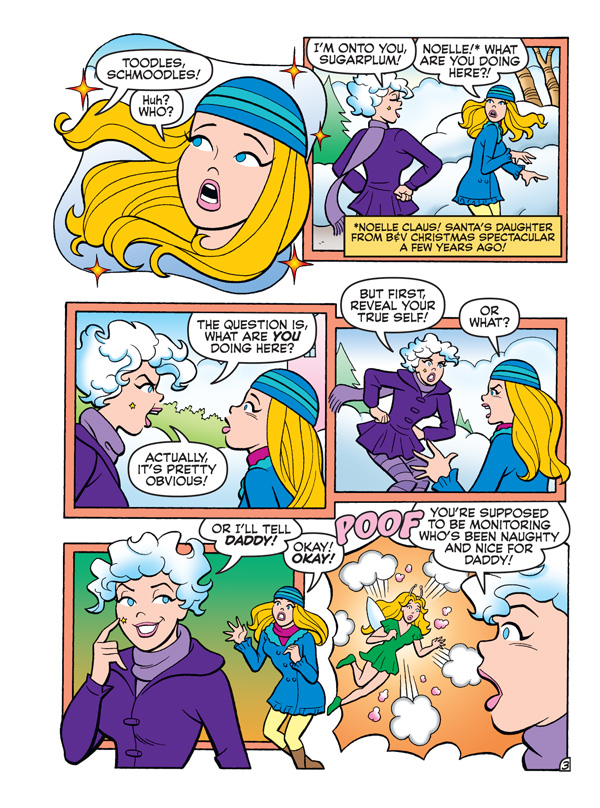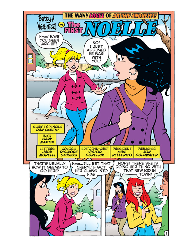 “The Many Loves of Archie Andrews” part 2! Eight girls have entered Archie in the “Best Boyfriend of the Year” contest—but wait until you see who Archie has nominated! Let’s just say, she’s a seasonal love interest. And she’s not the only Christmas gal to spice things up! But just how long will Betty & Veronica stay merry before they start getting mad? Archie’s usual love triangle gets a festive twist in this fun, brand new ongoing lead story to this JUMBO comics digest!