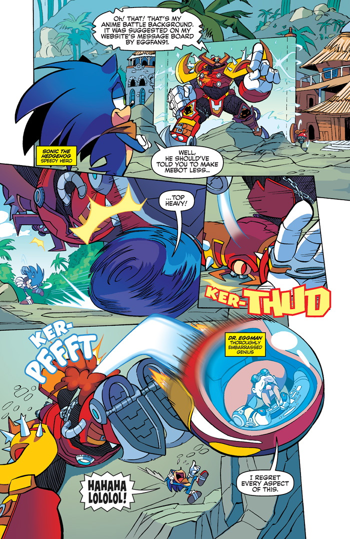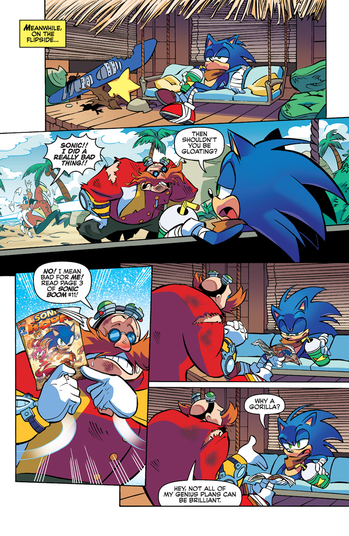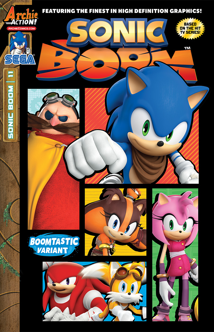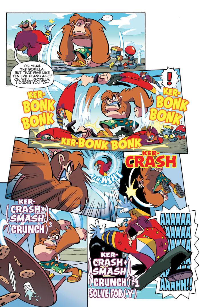 Follow up after the “WORLDS UNITE” crossover with a BOOM in this EXPLOSIVE eleventh issue! “Eggman Gets a Gorilla”: When Dr. Eggman’s regular robotic enforcers just can’t cut the mustard, he hires some additional help! (Because, seriously, how hard is it to cut mustard?) Introducing the mighty, Kyle the Gorilla! Is he really the next APE wonder of the world? Or will Sonic get yet another reason to point and laugh? You’ll be pointing and laughing too-but in a good way! Featuring cover art by rising star Diana Skelly plus a “BOOMTASTIC” variant with art provided by SEGA!