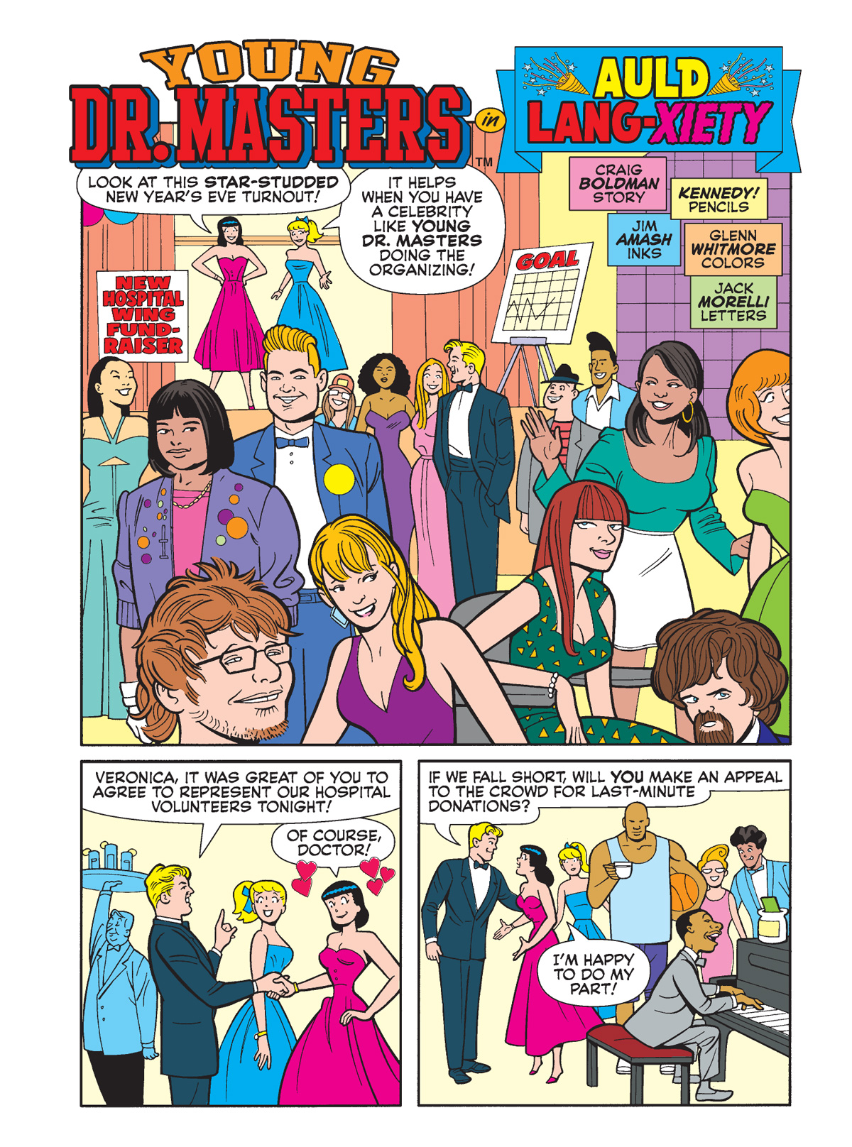 The cover of BETTY & VERONICA DIGEST #320. Betty and Veronica celebrate the new year with party hats and streamers.Young Dr. Masters is back with a New Year’s Eve party to remember. we’ve got special guest stars galore (try to spot them all!) but will it all be undone by an epic B&V bicker? The fraught frivolity goes down in “Auld Lang-xiety” by Craig Boldman and Pat Kennedy!