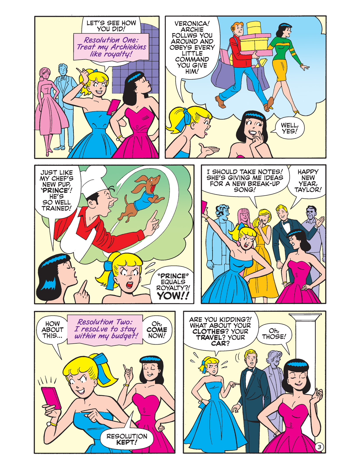 A panel from an Archie Comics story. Betty pokes fun at Veronica for never keeping her New Year's resolutions.