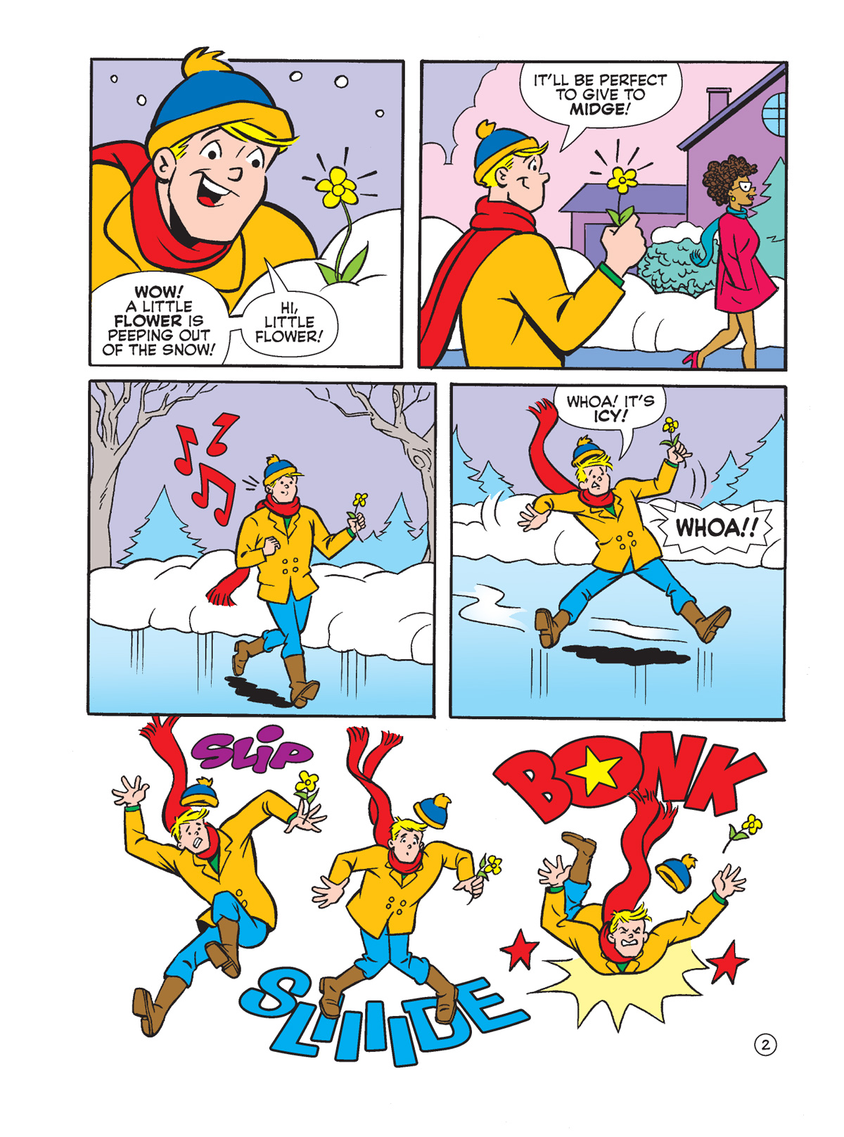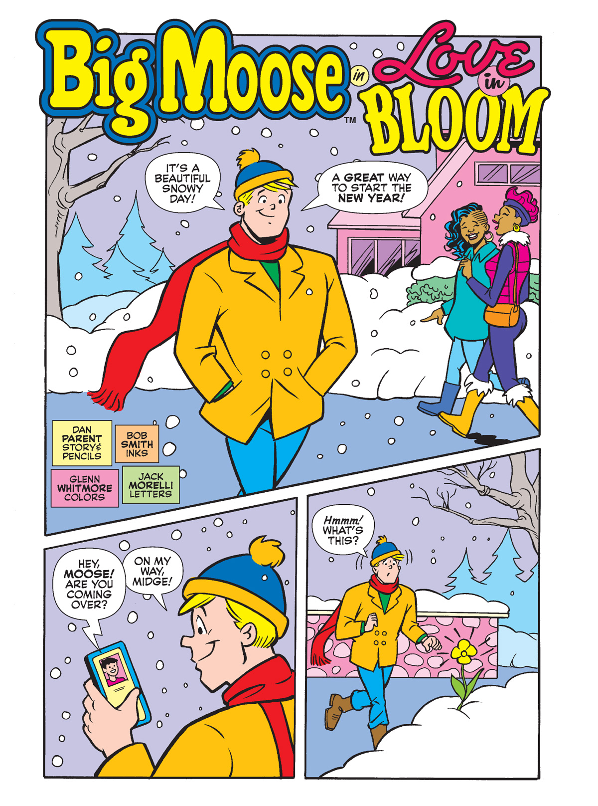 Then, following his marathon caper last week in ARCHIE DIGEST #346,  Big Moose is on a snowy walk when he gets a few ideas on how to impress Midge. But he’s big, it’s pretty icy out there, and you can guess how it turns out! That’s in a tale called “Love in Bloom” by Dan Parent.