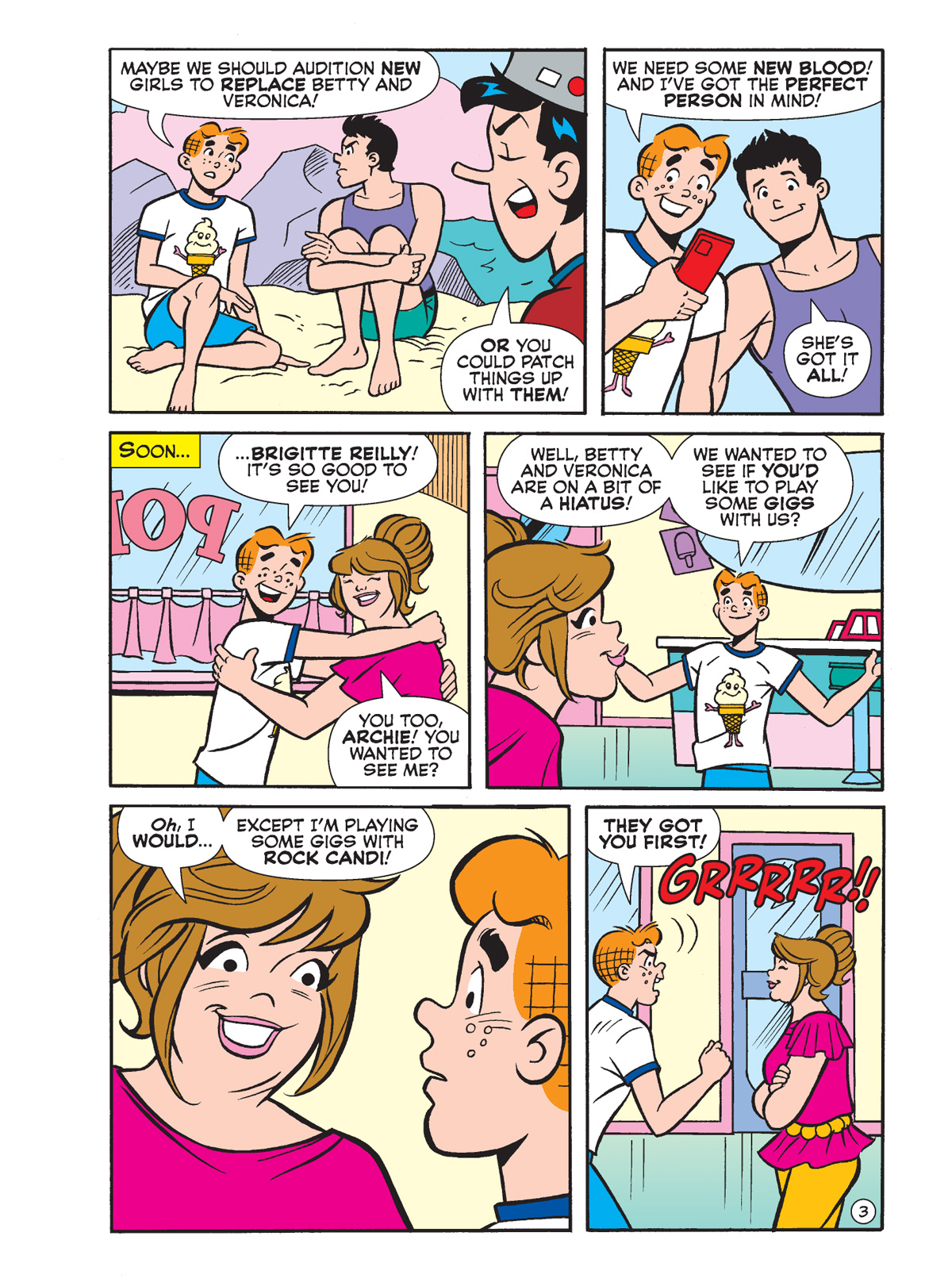 When we last saw drummer Jola Kitt and her new band Rock Candi, they were just getting started, opening for Bingo Wilkin and solving mysteries (as one does!). But now the group is really starting to take off, and Archie’s feeling a little peeved — Betty and Veronica did quit The Archies to form Rock Candi, after all! Well, he’s got a plan to get some of their juice back; you’ll have to read “Hey, Hey, We’re the Archies!” by Dan Parent to see what happens next, and we’ve got a preview below!