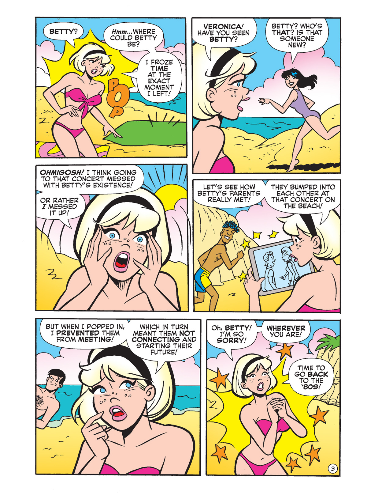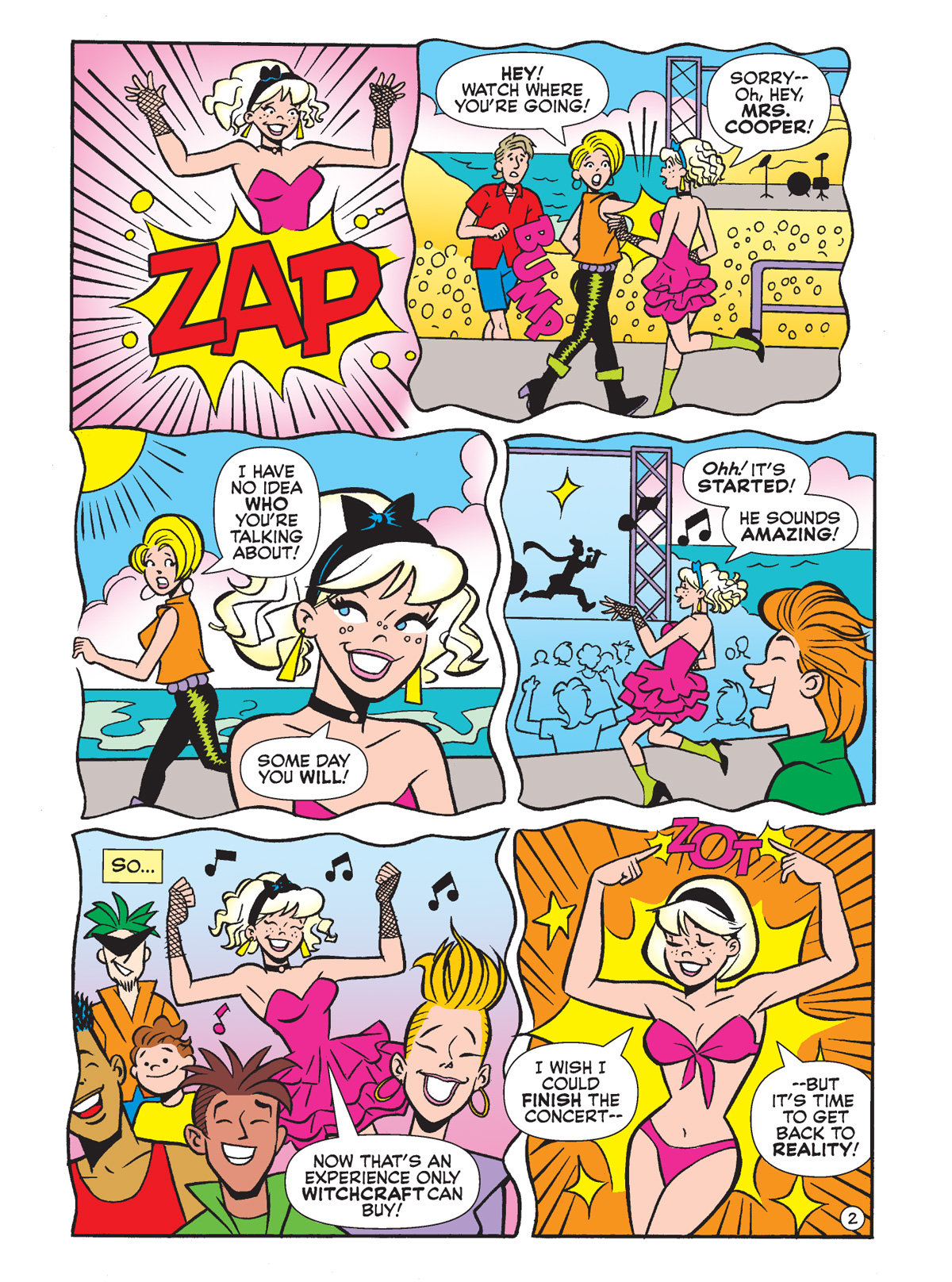 In an all-new story by Dan Parent, Sabrina wishes she could see her favorite band from the 1900s, and then realizes she actually can! (With a little help from her magical powers, of course.) But things don’t go as smoothly as she’d like; when she bumps into teenage Mrs. Cooper, she accidentally sets in motion a chain of events that changes the future of Riverdale! It all goes down in “Retro Beach Bash a Go-Go!” and you can preview that one below!