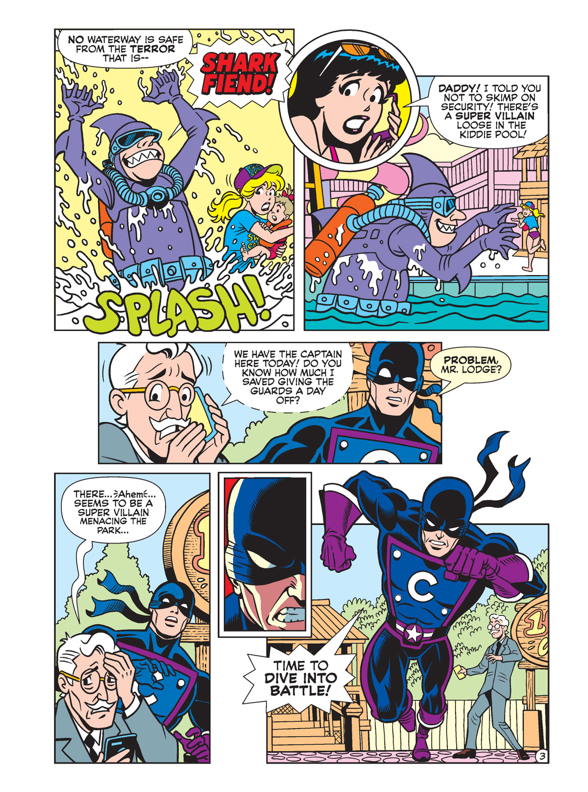In “Off the Deep End” by Ian Flynn and Steven Butler, the naval superhero is thankfully on-hand for the opening of Mr. Lodge’s new water park when that fin-headed creep shows up to make a mess of things. As the good captain likes to say, “Time to dive into battle!”