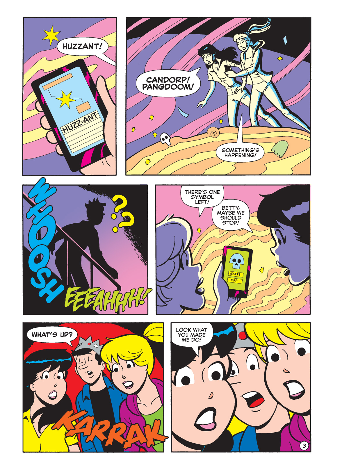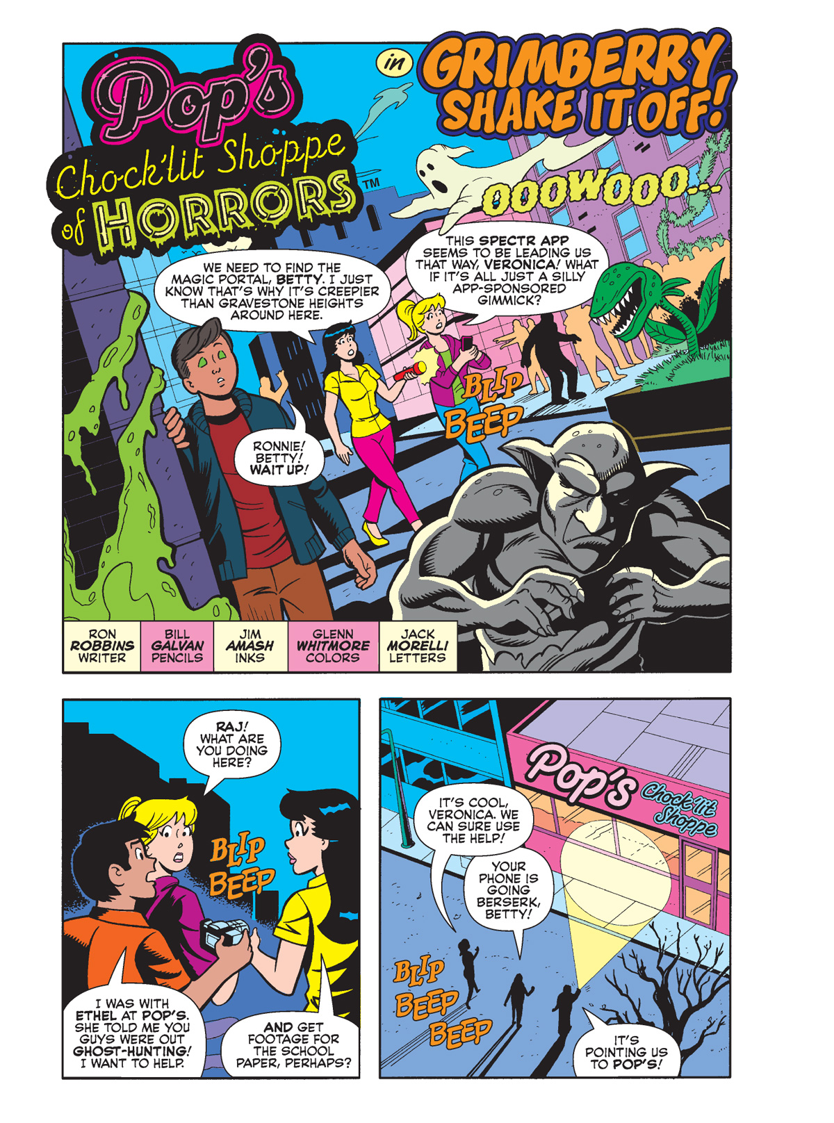 When the girls use a new app called Spectr they learn that a secret portal to another dimension is the cause of spooky goings on all over town. Now they just have to solve this spectral problem once and for all! Jughead doesn’t seem to care, but at least B&V are on the case. It all goes down in “Grimberry Shake it Off” by Ron Robbins and Bill Galvan.