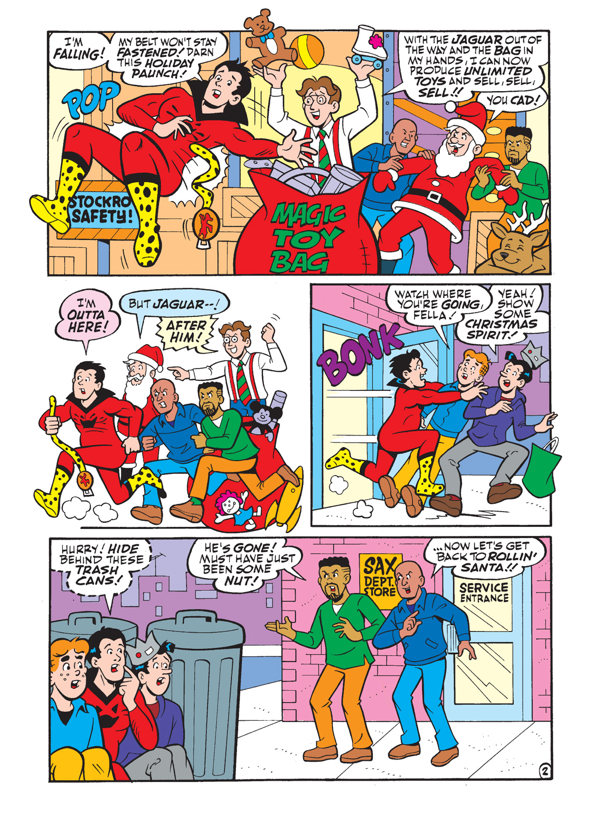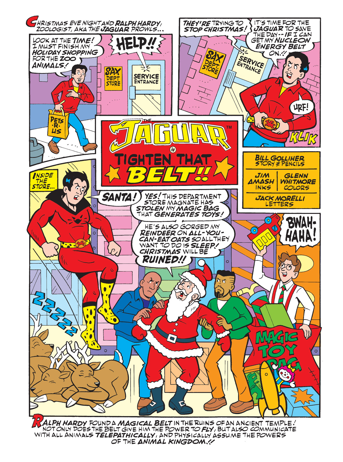 Following his adventure last week in WORLD OF BETTY AND VERONICA DIGEST #31, Ralph Hardy (a.k.a. the Silver Age Jaguar!) is back in a new tale by Bill Golliher where he has to save Christmas once again. There’s just one problem: after a few too many Christmas cookies, his magical belt doesn’t fit. Relatable!
