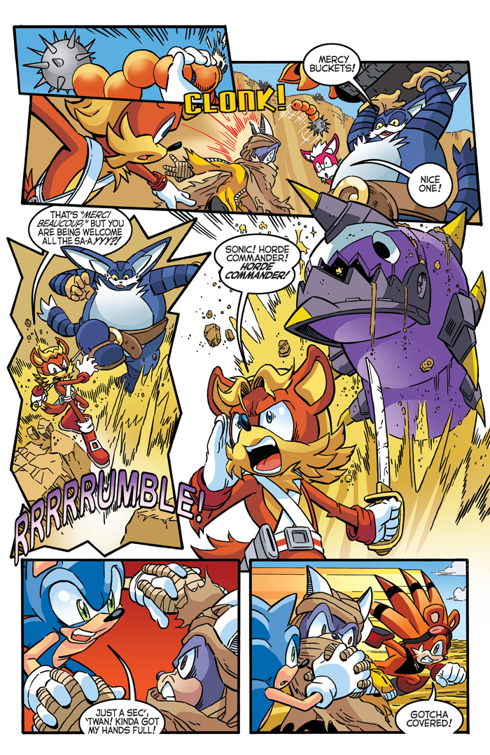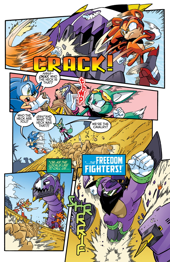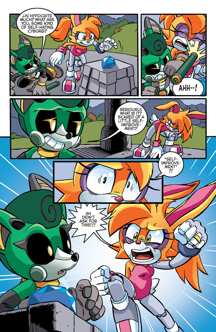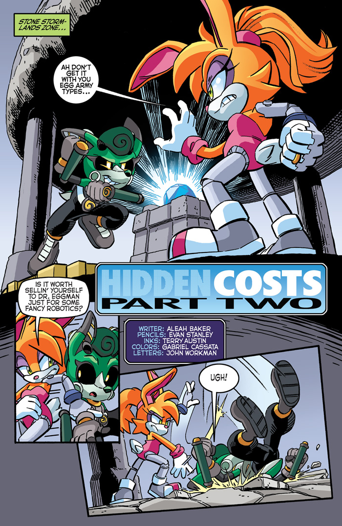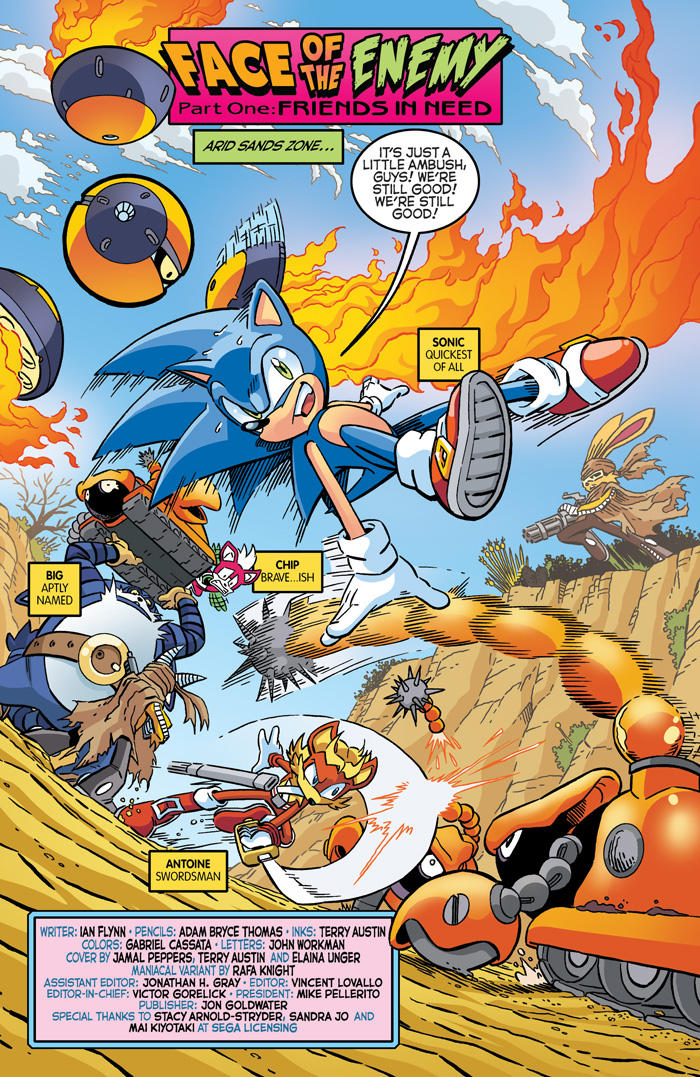 SONIC’s planet-wide chase CONTINUES!”Face of the Enemy” Part One: Sonic, Antoine and Big head to Shamar to rescue another Gaia Key Guardian! They’re calling in the reinforcements and getting some help from the local Freedom Fighters-but will that really be enough to get past the fearsome Egg Army? Then, in “Hidden Costs” Part Two: Get ringside seats to Bunnie vs. Cassia. It’s the can’t-miss Cyborg fight of the century! Featuring cover art by jamming Jamal Peppers and a “Maniacal” variant By CG artist Rafa Knight!