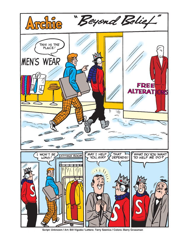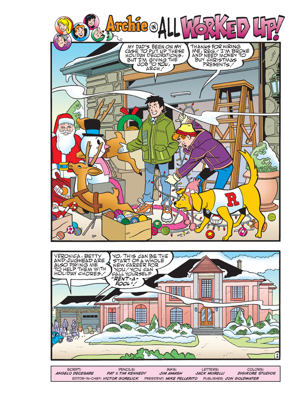 Archie, desperate for money to buy Christmas gifts, decides to lower himself in the worst possible way for a little Christmas cash: he’s going to rent himself out to his friends—at least, they WERE his friends, until they decide to take advantage of Archie’s situation by making him to do all the holiday chores they don’t want to! Will they remember the true meaning of the holiday before it’s too late? Find out in “All Worked Up!” the fun, festive new lead story to this comics double digest!