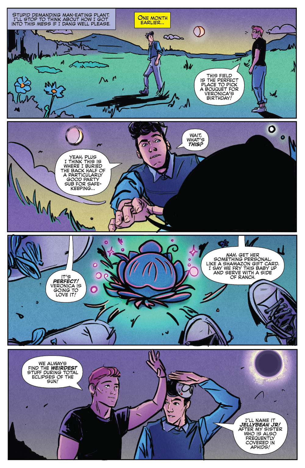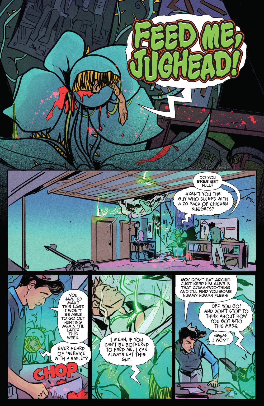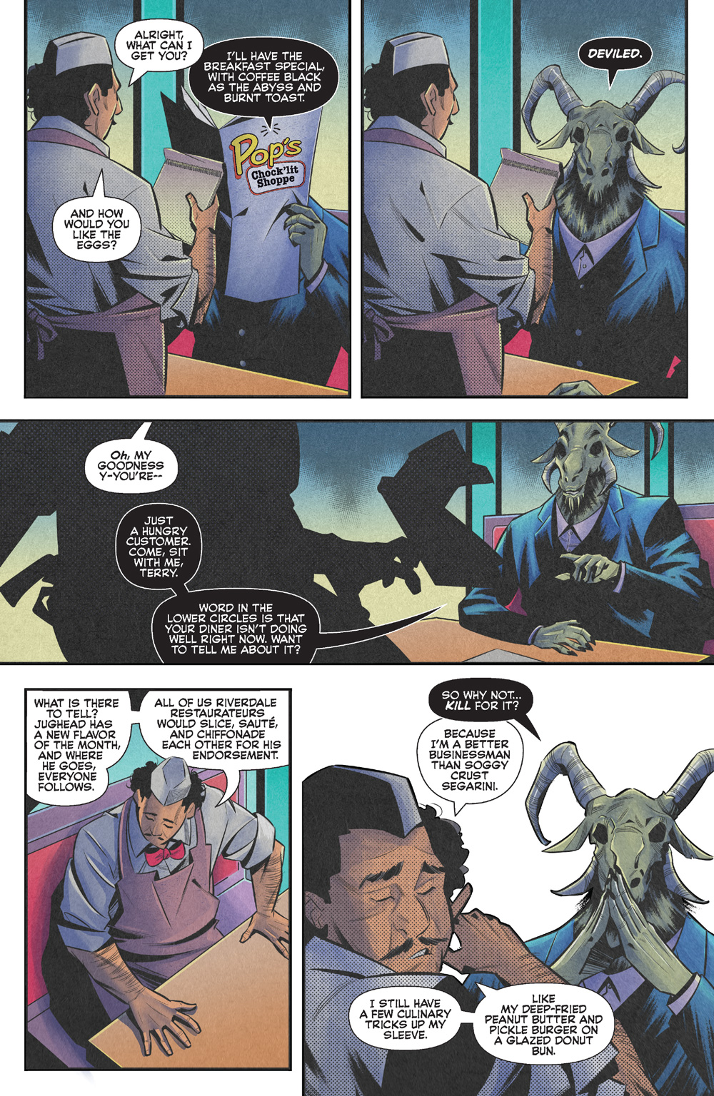 In the frame story, “Lord of the Fries,” written by Archie Horror Scream Queen Amy Chase with art by Master of the Macabre Federico Sabbatini, we learn that Pop once had a rival that ate up all his business, that is, until a mysterious monstrous stranger showed up and offered him all his hopes and dreams . . . for a price. (We know those situations never go well!) The fallout from this fateful and fatal moment continues in “Feed Me, Jughead” by Jordan Morris and Liana Kangas and “Free Market, Free Range” by Ryan Cady and Chris Panda.