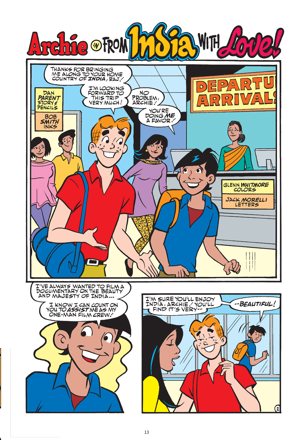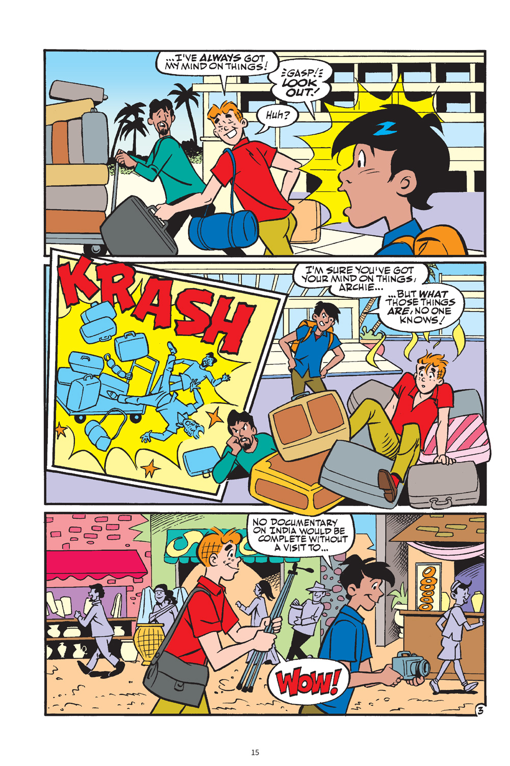 The trade paperback in stores this week collects every adventure Archie and the gang have had in India so far, but that’s not all! In a BRAND-NEW story by Bill Golliher and Dan Parent, we meet new ongoing cast member Prasad Arora for the first time. He’s a busy Bollywood star but that won’t stop B&V from wreaking havoc all through Delhi to get his attention. You can preview that one and read “From India With Love!” (also by our friend Dan) in full below. And once you’re caught up, grab your own history-making copy here!