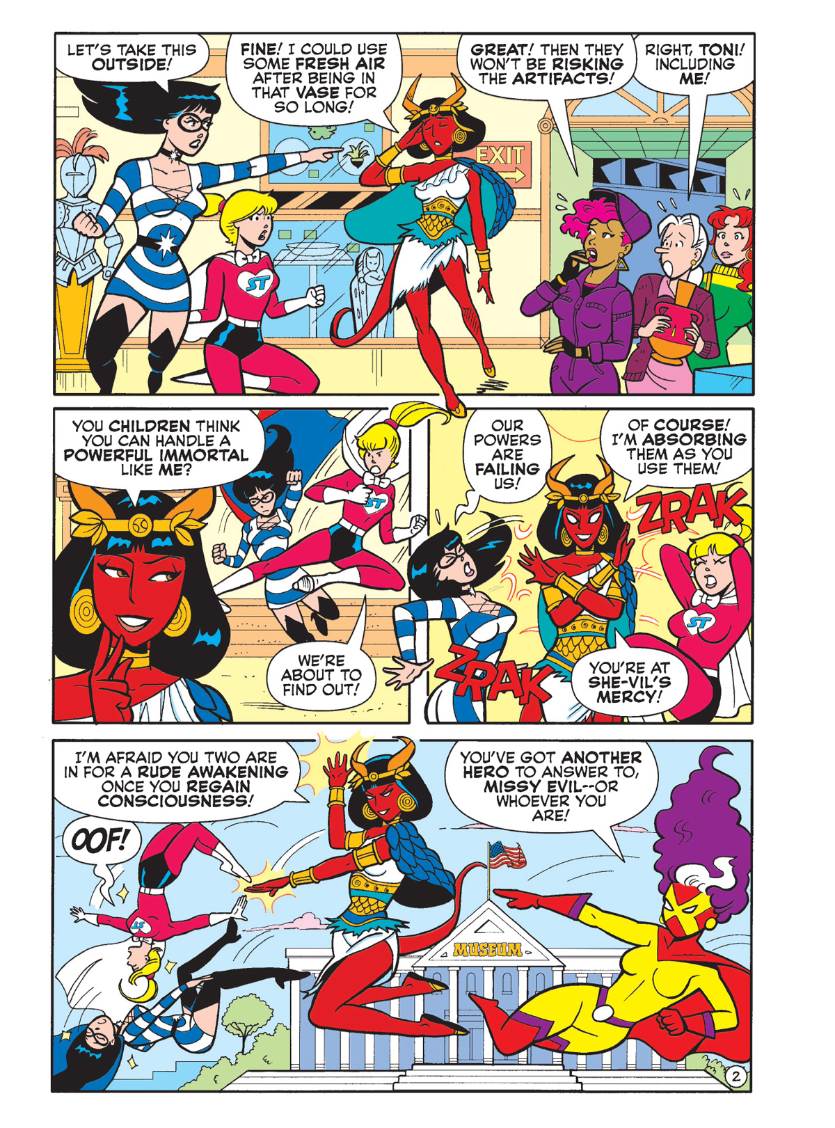 You may remember that way back in BETTY & VERONICA DIGEST # 327 (OK you’re right, that was only two weeks ago!) we met a striking new superhero, the masked marvel known as Wonder Teen X! No one knows who she is, and the mystery only deepens when she returns this week to battle an ancient baddie known as She-Vil. It’s an action-packed archaeological adventure by Bill Golliher and Holly G!